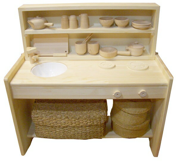 最安値を楽天市場で探す>幼心に温もりが伝わる木製【おままごとキッチン・食器フルセット】【組立キット】机にも変身するお得な特製手作り玩具